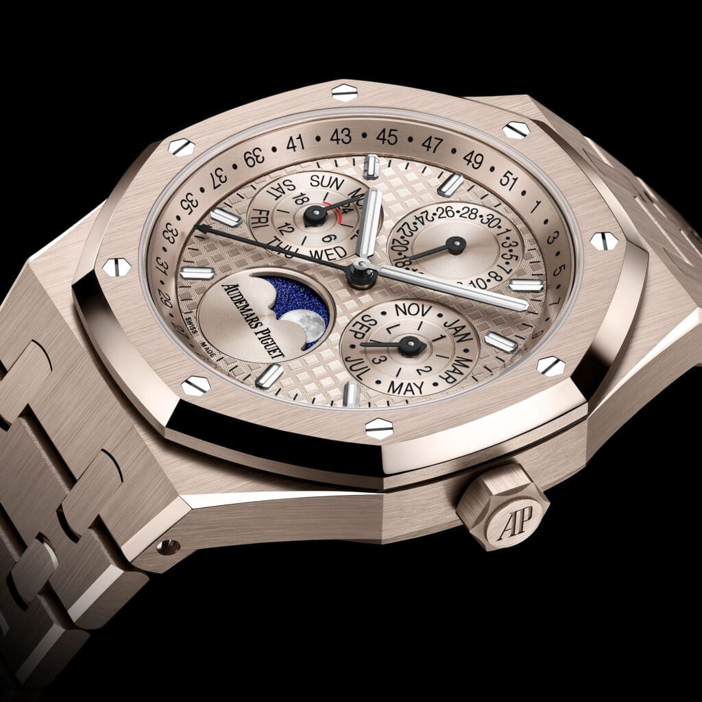 Three 41 millimetre references present the movement. A white gold Code 11.59 appears alongside two Royal Oaks in steel and sand gold. While the silhouettes remain familiar, the user experience becomes more intuitive. Perpetual calendars often reward patience. This one rewards instinct, offering clarity without altering the character of the complication.