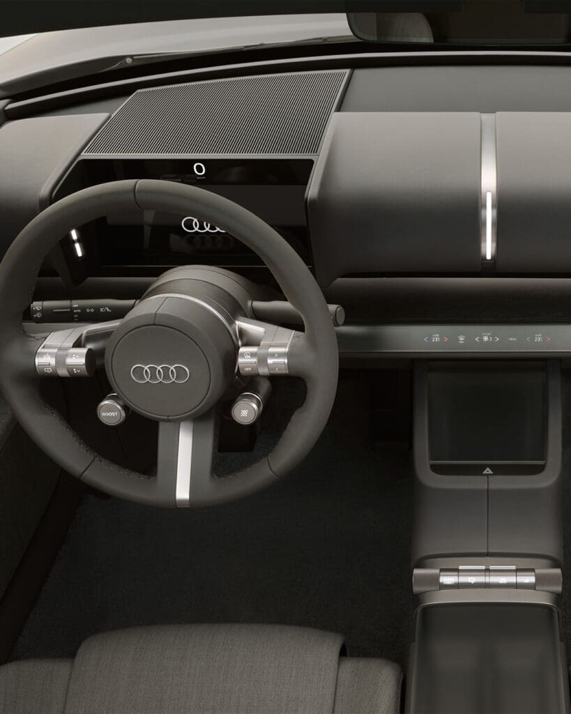 The interior follows the same ethos of clarity and focus. Designed for two, it blends geometric forms with a driver-centric architecture. High-quality materials such as anodized aluminum switchgear deliver the unmistakable “Audi click,” while full-metal Audi rings at the center of the precision-crafted steering wheel highlight craftsmanship at its finest. Natural materials, subtle titanium-inspired tones, and atmospheric indirect lighting further heighten the cabin’s refined warmth.