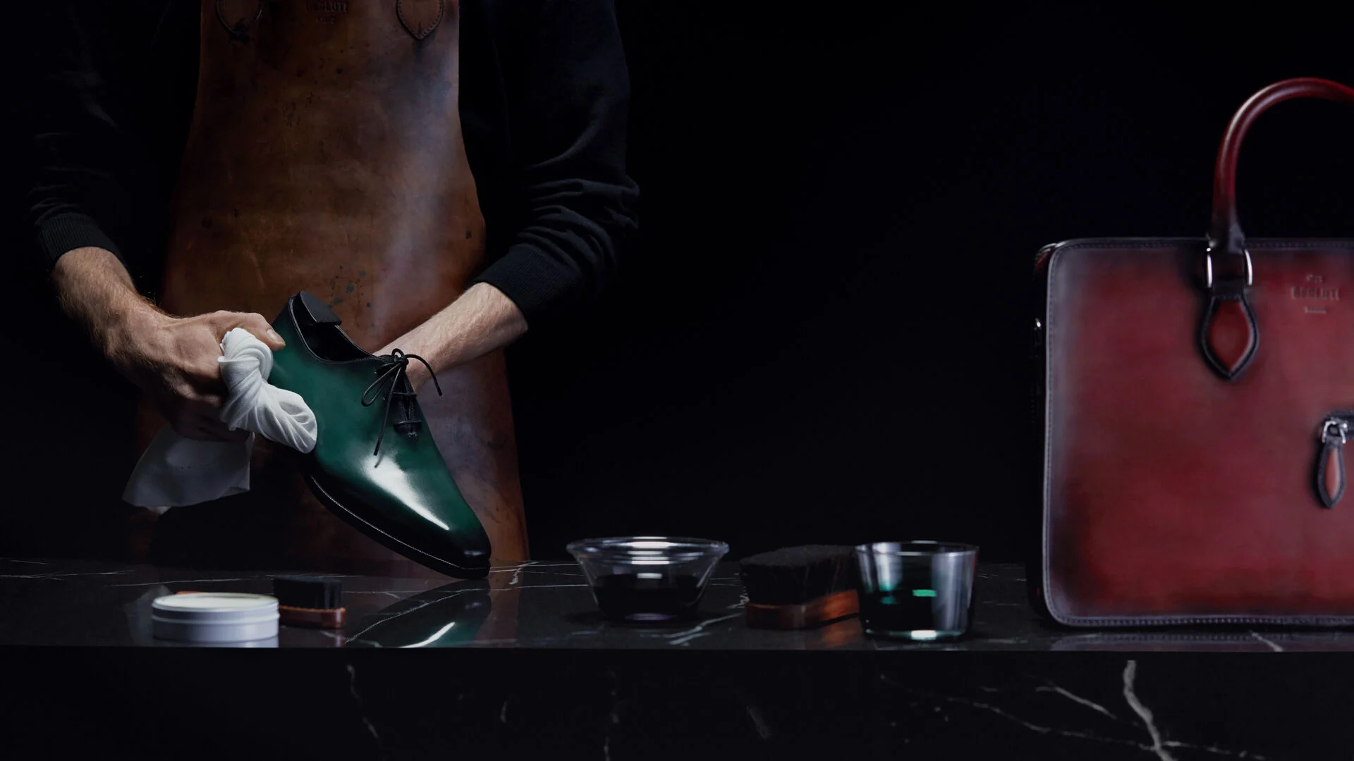 A Berluti patina begins by hand. Brushes, cloths and sponges replace the painter’s palette, and the colourist builds depth layer by layer. The leather is cleaned, nourished with oils, then gradually brought to life with pigments and waxes. The final glazing gives the surface its glow, not as a layer of polish but as an awakening of what already lies beneath. Watching this process at the Maison’s patina bar reveals the essence of craftsmanship: repetition guided by instinct, precision softened by touch.