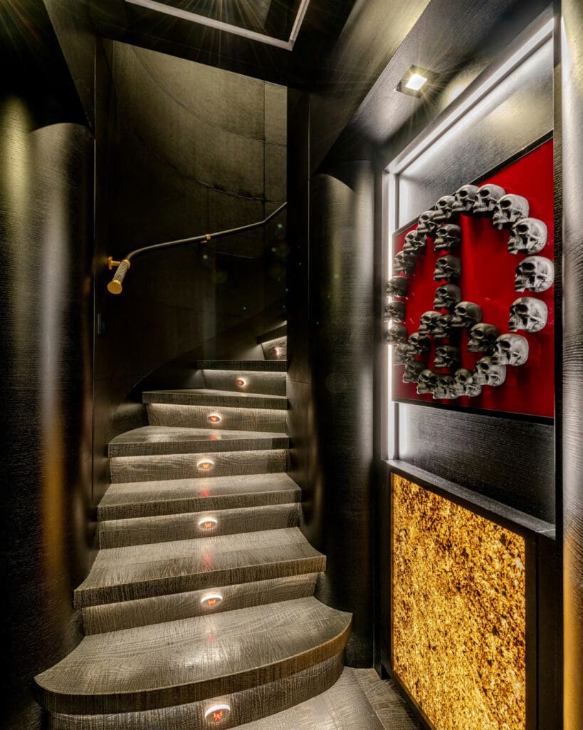 Inside, accommodation is for up to 10 in four cabins, anchored by a full-beam owner’s suite with a private study and a dressing room. The separation of spaces is the luxury here. There is a dedicated gym for those who keep the ritual, and a cinema room that can convert to sleeping space as needed. The atmosphere shifts convincingly from social to secluded: the hush of a closed study door, the dim calm of a cinema, the simplicity of a corridor when the party is still going outside.