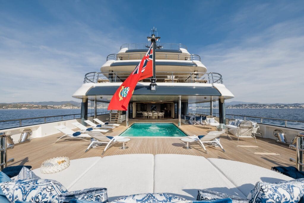 Launched by Amels and extended by six metres in a 2020–2021 refit, the yacht sits in that sweet spot where scale meets modernisation. The work was extensive, not cosmetic. The result reads like a considered brief rather than a refit tick list. There is a generous beach club with shell door platforms that fold to meet the water, a 7m main deck pool that picks up the sun in shifting blue tiles, and a large spa for days when the sea air needs company. Accommodation is flexible for 20 guests, anchored by a dedicated owner’s deck and two bridge deck VIP suites with private balconies. The presence of dual helipads is the stand-out. Few yachts under 90 metres can match that level of logistical freedom.