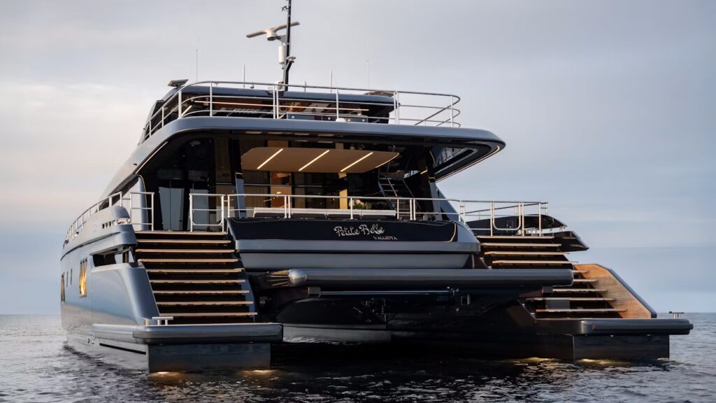 The numbers are straightforward. Petite Belle measures 94 feet, is offered by Northrop & Johnson, and carries an asking price of €16.5 million. Luxury cats like this are changing how owners think about time on the water. A wider platform means stability at anchor, a near-constant flow between indoors and out, and the ability to host without the bustle. In other words, a yacht that privileges the two places you spend most of your time, the deck and the main salon, over a top speed you will almost never use.