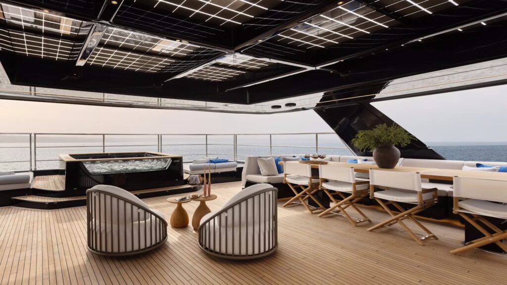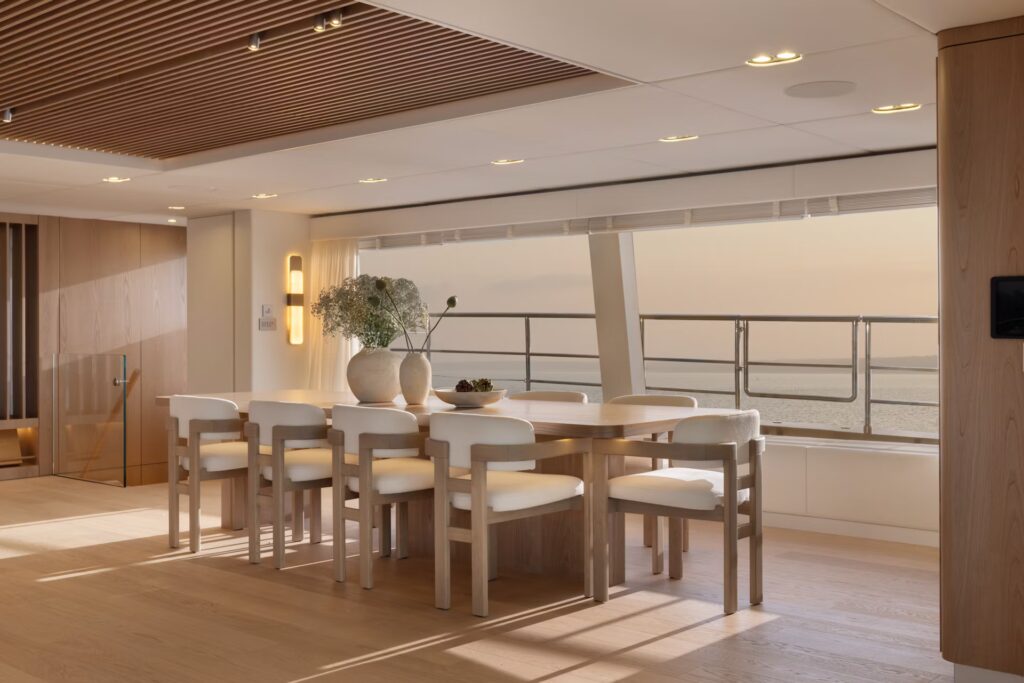 The photographs tell a clear story of volume used intelligently. Broad terraces descend to the water and frame an outdoor living zone that feels more beach club than cockpit. There is room to spread out, to set a breakfast table and still have a quiet corner for a book. Warm teak underfoot and the soft slap of water along the steps set the tone for slow mornings at anchor.