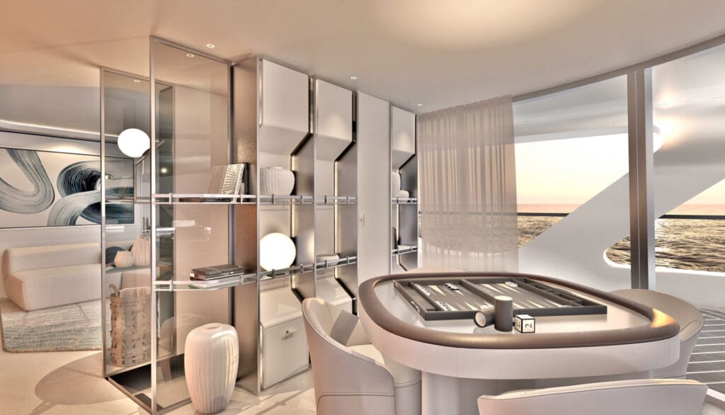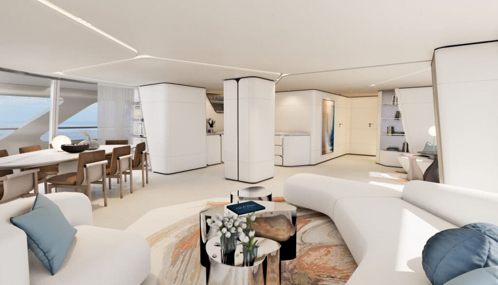 Below deck, the interiors are conceived as calm, light filled spaces. Natural materials, restrained tones, and a focus on proportion create an atmosphere that feels both luxurious and deeply relaxed. Comfort is delivered through design intelligence rather than excess.