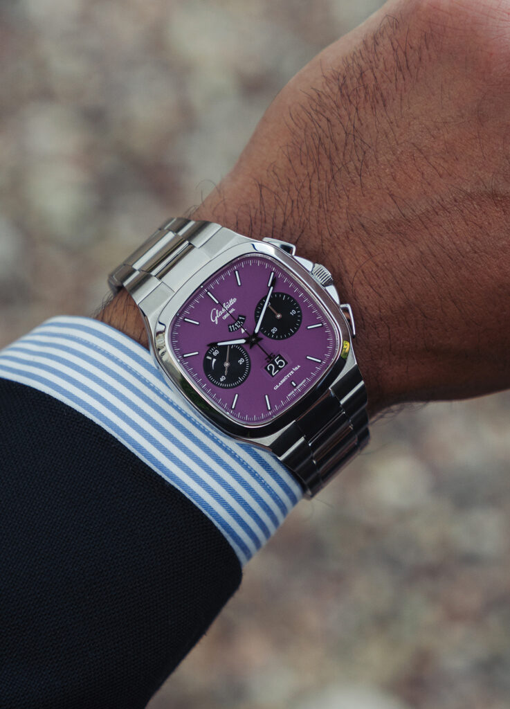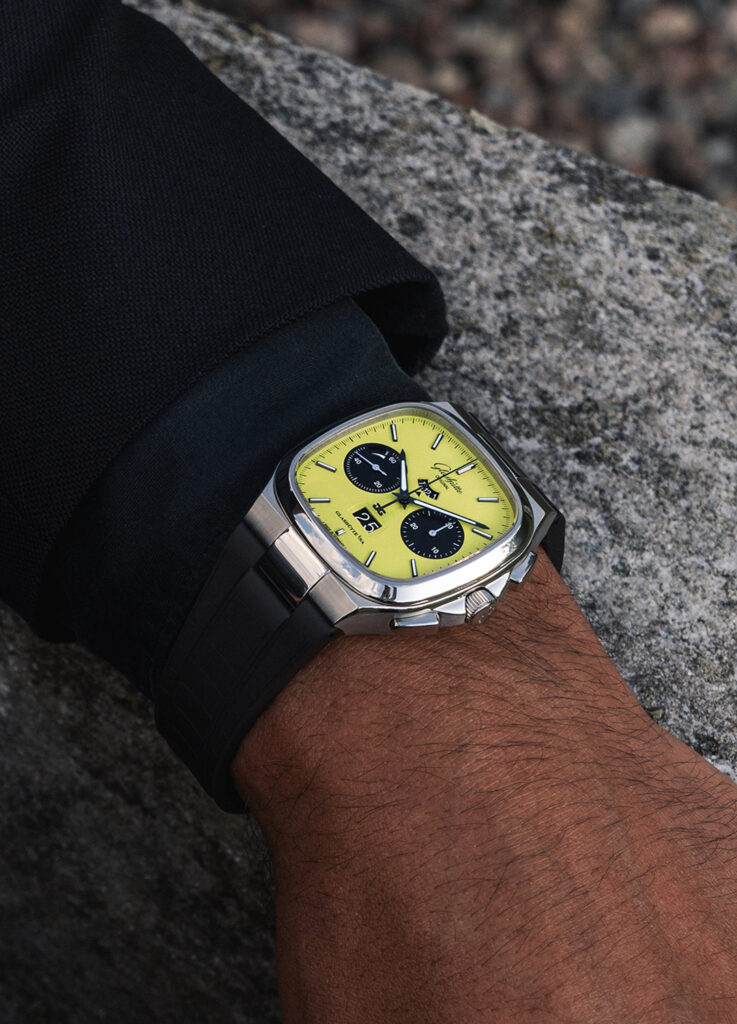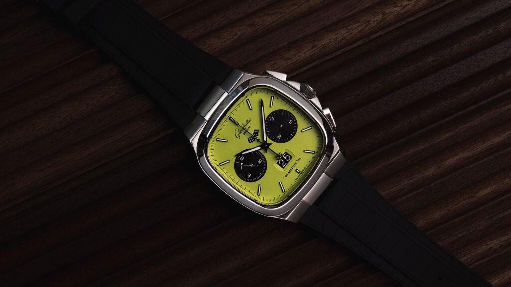 Earlier this summer, I had the opportunity for a rare sneak peek at two new limited-edition Glashütte Original Seventies Chronograph Panorama Date models: the “Plasma” and the “Fusion”. This preview included the rare chance to spend a week reviewing and testing them ahead of their official release. Both reinterpret the classic 1970s square chronograph case, merging period design with bold, contemporary dial colors. While each offers its own distinct personality, the Fusion in vivid lime green ultimately became my favorite.