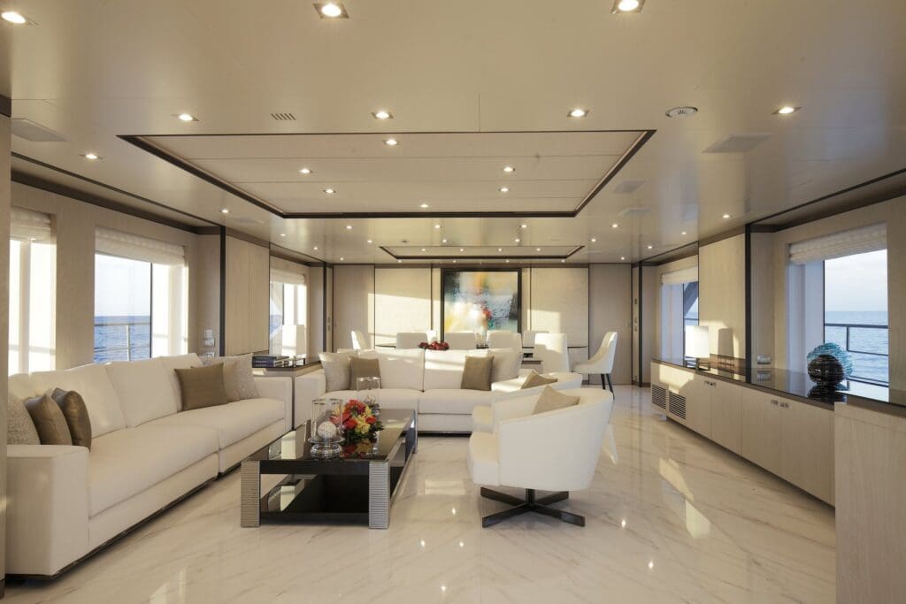 Inside, the brief leans formal without being stiff. Marble floors cool the air under the main lounge and dining room, where picture windows frame the horizon like a slow film. Up top, a sky lounge with bar opens to a terrace, the social heart when you want doors sliding and music low. Accommodation is set for 10 guests in five cabins, including a full-beam owner’s suite with private study and a spa-style en suite. Zero speed stabilisers handle the quiet hours at anchor. The materials and plan speak to Mediterranean service rather than theatrical gimmicks.